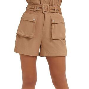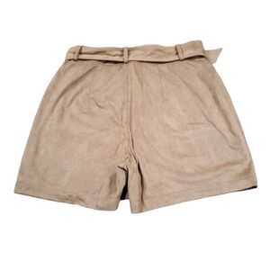 Guess Mariangela Faux Suede Cargo Pocket high rise belted shorts in "Wet Sand" light brown or dark beige. New with tags. Has Two front pockets with flap and buttons, and adjustable belt with buckle at the waist. Women's size small, real measurements shown in photos with shorts laid flat: