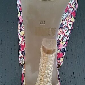 A pair of sexy floral platform heels, featuring a peep toe and slingback design.
