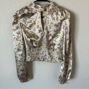Elegant floral satin blouse with long sleeves. Features a beautiful floral pattern in cream, yellow, and pink. Has some small pulls by the left armpit I do have pictured.