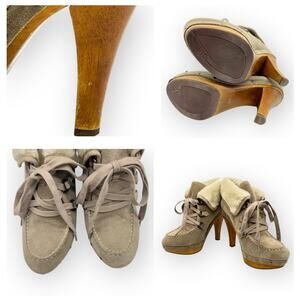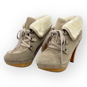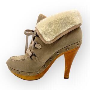 Guess GW Bountiful Wood Platform Fur Lined Ankle Bootie Tan Suede Leather