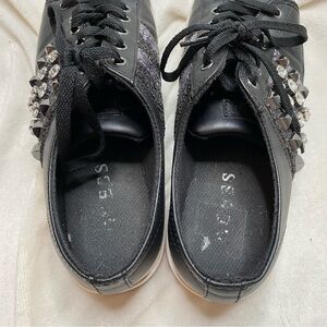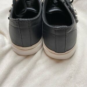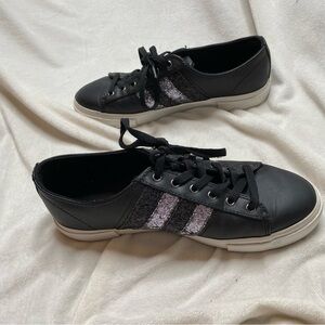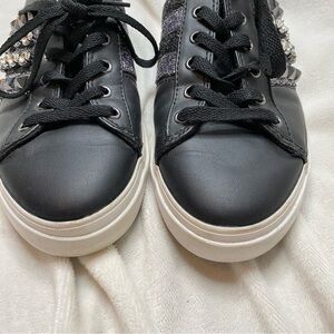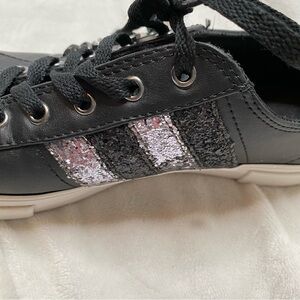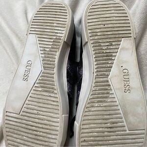 Guess Gally Black Silver Glitter Rhinestone Sneaker. Faux leather upper with white, vulcanized rubber sole. Lace up styling with alternating gunmetal studs, clear rhinestones, on silver and black glitter stripes. Insoles have solid silver and black glitter stripes. Excellent preloved condition, please review all photos of shoes.