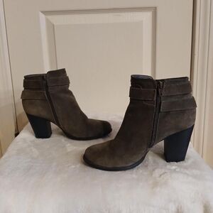 Guess Gather green suede ankle bootie with chunky black block heel size 7