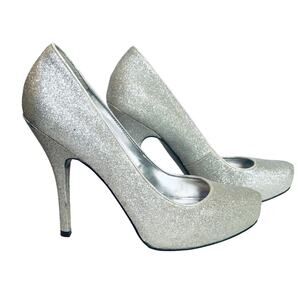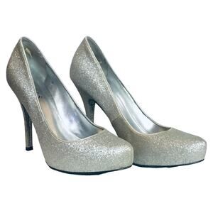 Silver glitter high heel pump by Guess. Tiny spot on the back of the right pump. Very light signs of wear. Comes in original box. Box is missing top.