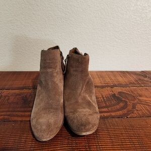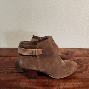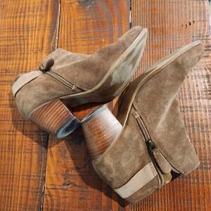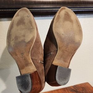 Guess Geora Ankle Boots. 100% suede leather. Buckle detail. Side zipper. Block heel. Tan/brown color. Super stylish!