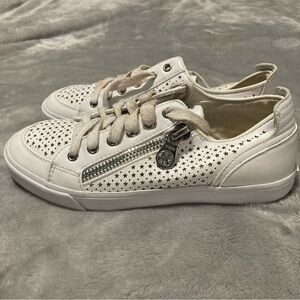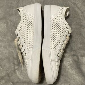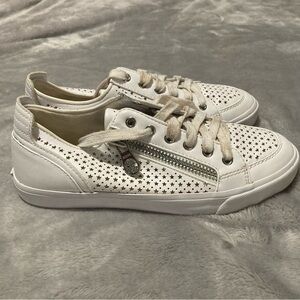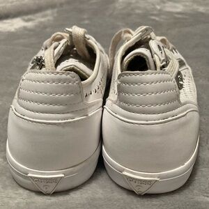 Guess Gianah White Star Perforated Lace Up Sneakers Zipper Details Chrome Hardware Leather Sole Size 7. Laces are stained, needs new ones. These would be great to customize and paint!