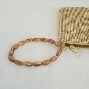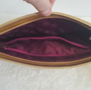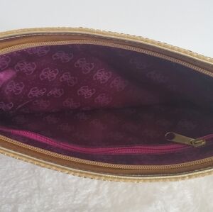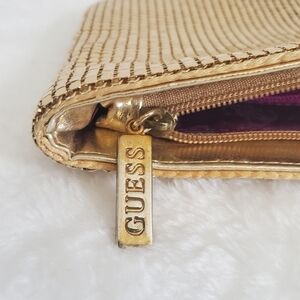 Guess Gold One Starry Night Collection Metal Metallic Mesh Clutch Wristlet Purse. Brown beaded wristlet strap, top zip closure, purple/burgandy silk Guess logo lined interior with an interior zipper pocket. Branded Guess logo on zipper pull. Approximately 10" X 5". Easily fits your cell phone and plenty more accessories. Some tarnish on zipper pull but not noticeable, otherwise in great condition.