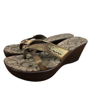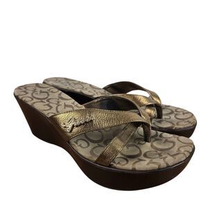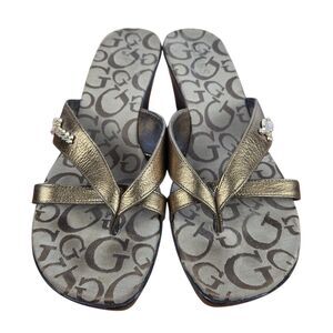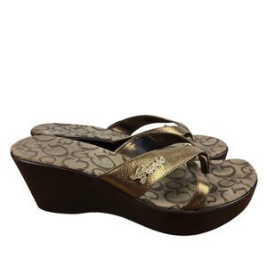 Guess Gold Rhinestone Logo Wedge Sandals Sz 8 M GWROOLIE Mcbling Bimbocore Glam