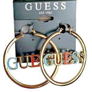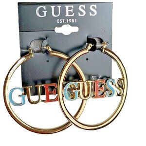 ITEM: Guess Gold-Toned Logo Letter Spelling Coral-Blue Medium Size Hoop Earrings
