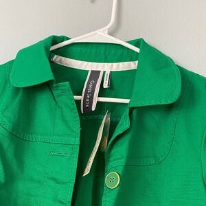 Stylish green blazer with short sleeves. Features button closure. Perfect for a trendy look.