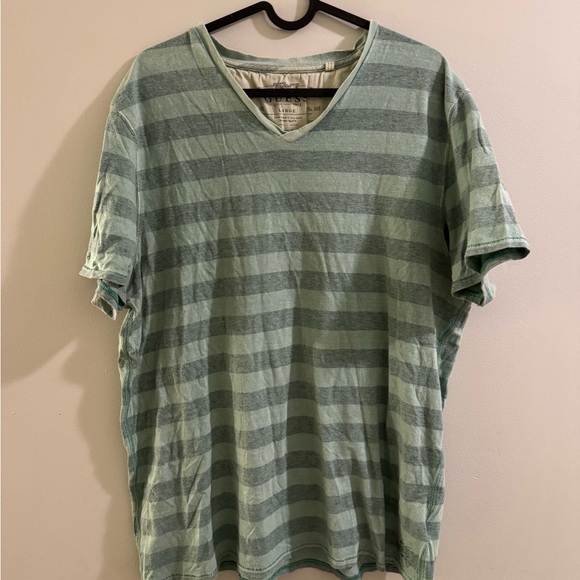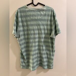 Casual and stylish green striped tee. Features a comfortable V-neck design. Ideal for everyday wear.