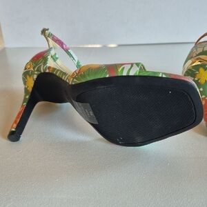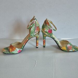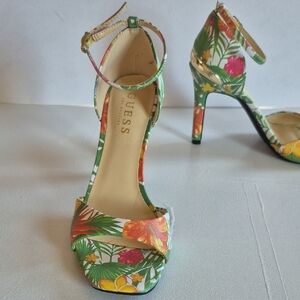 Elevate your style with these Guess heels, featuring a chic green and pink design. The stiletto heels and ankle strap closure offer both elegance and support. Perfect for adding a touch of sophistication to any warm-weather occasion.