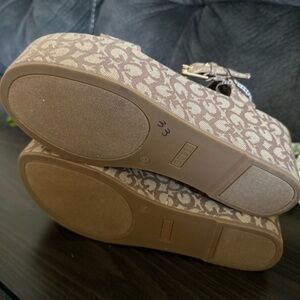 Guess Monogram G Logo Printed Brown Tan Canvas Platform Sandals