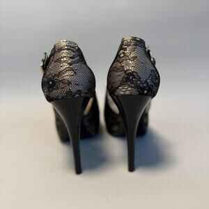 The Guess Gwhondola is a glamorous peep-toe platform pump featuring black lace over a contrasting base (often nude or gold satin). It is designed with a high stiletto heel and a hidden platform for added comfort and height. The shoe secures with a sleek slingback ankle strap and buckle closure, creating a sophisticated and dressy silhouette perfect for evening events.