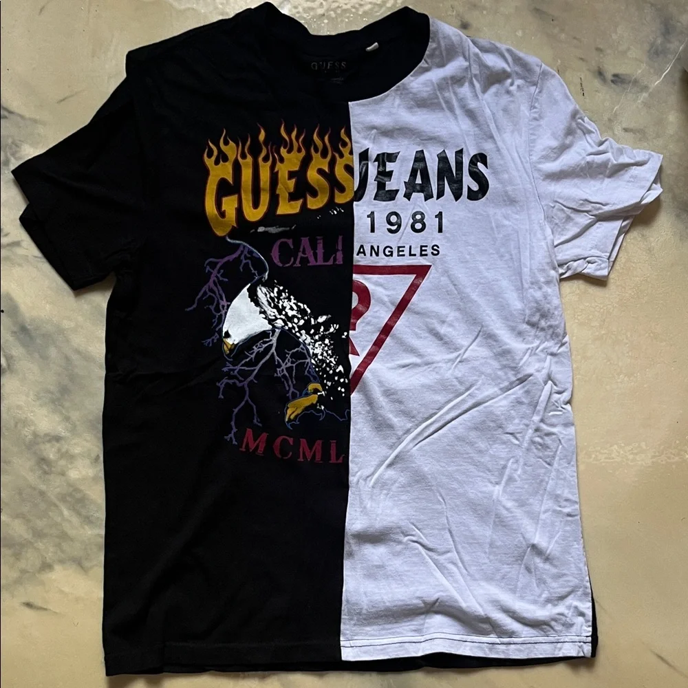 Split-panel Guess tee with bold front graphics. Left side black with flaming logo and eagle motif. Right side white with printed text and triangle emblem. Eye-catching contrast and vibrant accent colors. slim fit