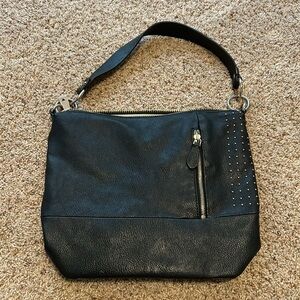 This looks and feels like a soft, buttery leather!! Studded front. Practical, hobo-style bag from Guess, made of soft eco leather, with zip closure. NO crossbody strap. The interior is trimmed with a branded lining. 3 inside compartments and 1 zipped pocket. Hidden zipped pocket at the back.