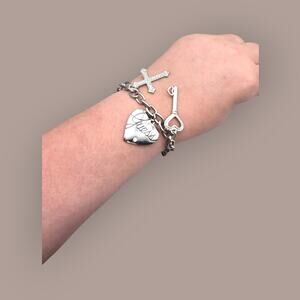 Guess Heart Key Cross Silver Tone Charm Bracelet with Rhinestones