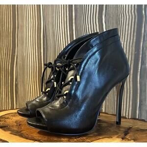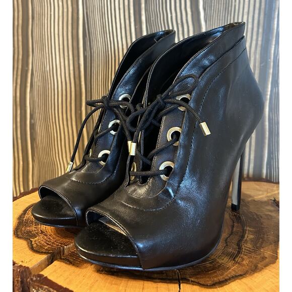 Guess Heels Lace Up Peep Toe Ankle Booties Black Buttery Leather Stilettos 7.5M