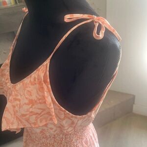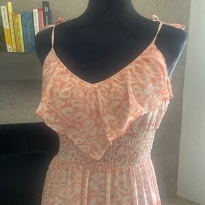 A feminine twist on classic camouflage, this sun-loving dress is the perfect warm-weather piece. Playful ruffles and a trend-driven high-low hem keep you looking fresh through the spring season and beyond. Dress is in great condition but there is a small tear in the back v, see photo #6 for detail.Sleeveless with adjustable tie spaghetti straps.