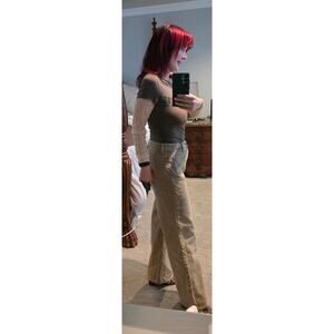 Step into classic ‘90s style with these Guess jeans in a versatile tan/beige wash. Featuring the iconic Guess triangle logo patch on the back pocket, these jeans have a wide-leg fit with a high-rise waist. They offer both comfort and style—perfect for everyday wear or retro-inspired outfits.
