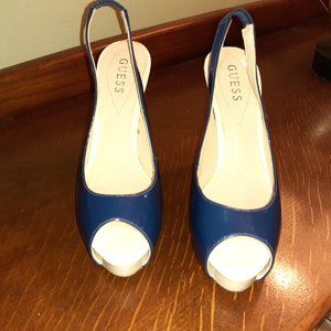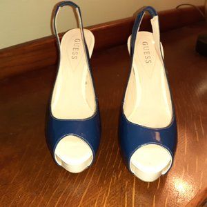 Guess navy, patent, platform high heels. The shoes are very sexy. The heels are 5 and 1/4" They have a slide on strap. There are no holes or scuff marks, except on the inside of the heels. Not to much. The size is 8 and a half.