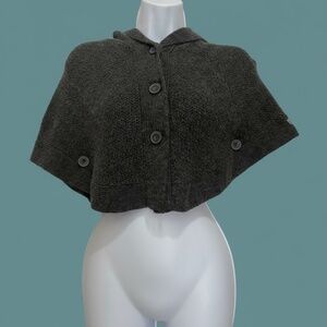 Cozy-meets-cute from Guess. This cropped hooded knit capelet features a soft charcoal wool-blend, oversized buttons at front and sides, and swingy, arm-slit silhouette—perfect layered over tees or turtlenecks.