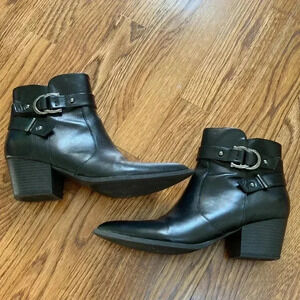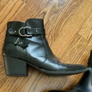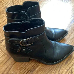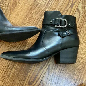“Description: The wrap-around buckle strap is the perfect addition to your fall look with the faux-leather, western-inspired G by GUESS® Illuse zipper bootie.
