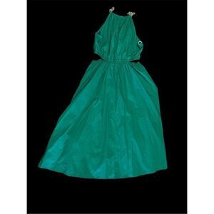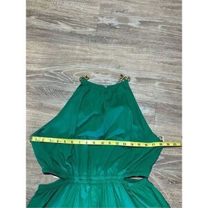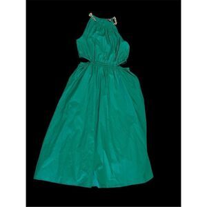 Guess halter style midi dress with side small cutouts. Lined skirt with gold chain straps. Sz L no flaws cotton and spandex dress with polyester lining. Measurements in photos