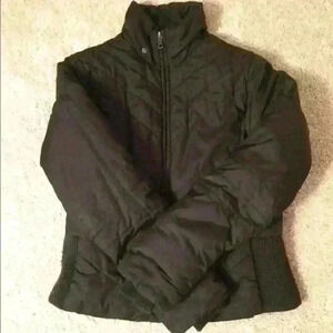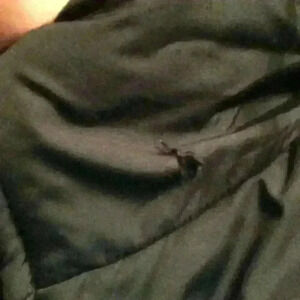Guess Black Jacket. 100% Polyester. Size L but fits like M. Normal wear. However there is a hole under collar where a button came off. Unnoticeable. See Pic # 4 otherwise in Great condition.