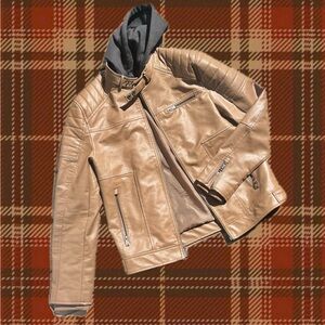 brand new brown guess faux leather motorcycle jacket with a detachable hoodie. perfect for fall/autumn bought for $130 #fauxleatherjacket