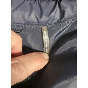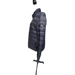 This is a women's Guess jacket in size Large, featuring a puffer style with a softshell fabric in navy. The jacket has a full zip closure, long sleeves, and zipped pockets. It is designed for casual occasions and suitable for winter, fall, and spring seasons. The jacket showcases embroidered and logo accents, with a mid-length and regular fit. Made of polyester material with insulation, it is machine washable and suitable for outdoor activities.