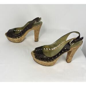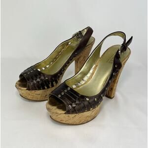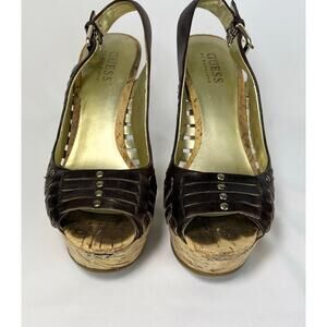Guess Jarrett Brown Strappy Leather Cork Platform Chunky Heels