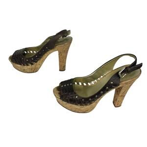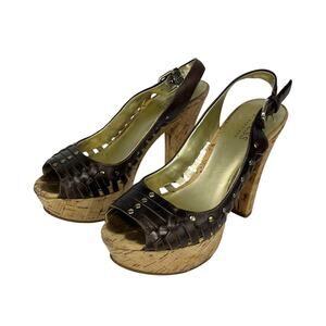 Guess Jarrett Brown Strappy Leather Cork Platform Chunky Heels