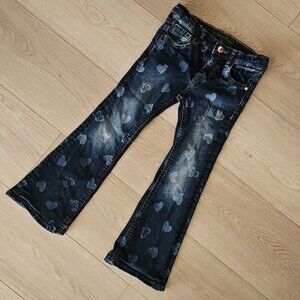 - Bell Bottoms / Wide Leg. dark wash with a light heart pattern. has copper detailing and guess logo on the back pocket. has a stretch mark in tbe elastane on the front left thigh as pictured