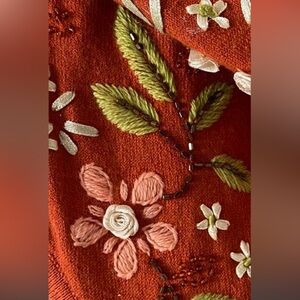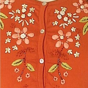 GUESS JEANS cropped cardigan sweater in rusted orange with beadwork, embroidery, and silk ribbon detailing on chest and sleeves.