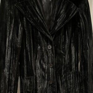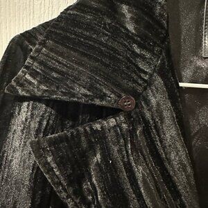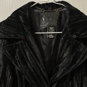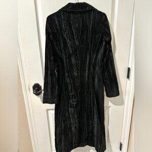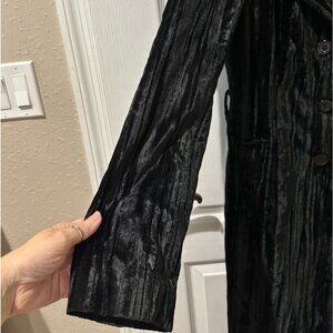 Black Ice crushed velvet look on this Guess Jeans Glamour Duster Trench Coat. You are Always ready for the parties, events & Gatherings with this in your closet! Pair it with jeans for a casual look or a dress for a dressier look either way you will be noticed! Double V notch lapel collar with 3 button closure. Pockets. Long slit in back with bottom stitch still attached. Lined.