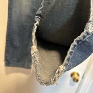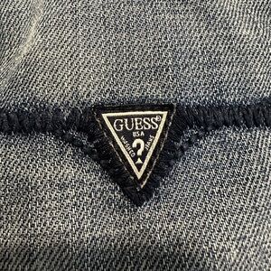Guess Jeans Mens Slim Straight Del Mar Fit Blue Dark Wash Denim Classic 34x30. Great broken in. 90’s style jeans. Faded, whiskers. Some distressing and wear at the hem. Noted in the photos. Please not the back patch is ripped but the jeans in great condition. No stains. Please see pictures for measurements.