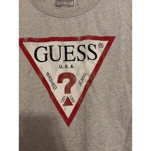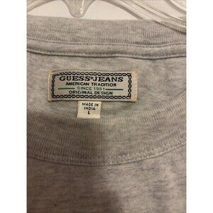 The product is a men's large vintage style T-shirt by Guess Jeans, featuring a red logo design on the front. The shirt is in a classic gray color with short sleeves and a regular fit, making it a stylish choice for those looking for a designer graphic tee. Perfect for casual wear, this Guess T-shirt combines comfort with a touch of high-end fashion, making it a versatile addition to any wardrobe.