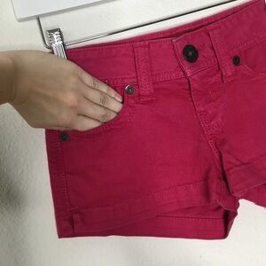 A pair of thick, pink denim shorts. They’re stretch style, but really don’t have too much stretch to them. Real pockets and large belt loops. Little slits on the sides. Super cute
