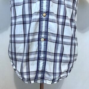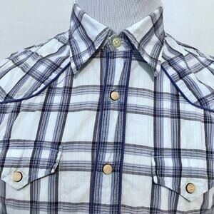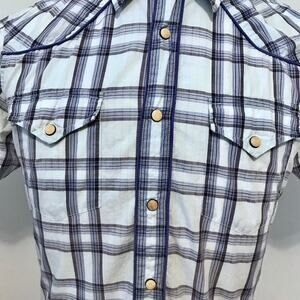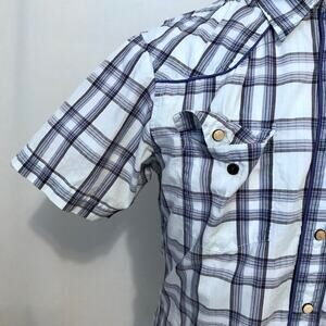 Excellent condition. Plaid Button Down Shirt for Men Size S. Short sleeves, white, grey, and blue family, front buttons are mix of snap buttons middle and 2 regular buttons collar and bottom shown in pic, 2 chest pockets with snap buttons for closure, embroidered brand logo "G" bottom left side, "Western" look, extra button. Pictures are part of description.