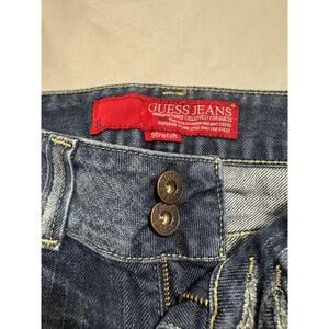 Vintage-inspired Guess Jeans stretch denim cutoff shorts with frayed hems and faded wash — the perfect Y2K look. Mid-rise fit with double-button closure, five-pocket styling, and signature embroidered back pockets. Excellent pre-owned condition with normal wash wear.