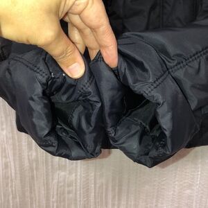 Has right inner cuff holes that are not seen when wearing; mild inside piling; fleece lined, sleeves are polyester lined; two front zip pockets; no hood