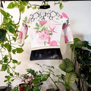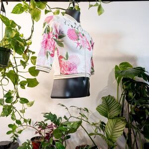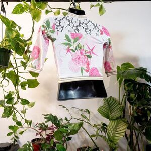 Guess Jr. coral-pattern kid's baseball jacket (S) 95% cotton/spandex blend, floral shoulder lace and gold accents. In great condition, no wear.