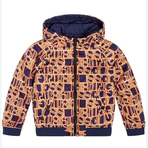 Stylish jean jacket with bold logo pattern. Features navy and orange colors. Perfect for a trendy look.