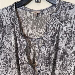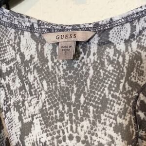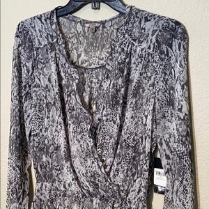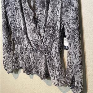 Brand new Guess L/S Snake Scarlett Wrap Top Phantom Multi Size Small. Ruffle wrap front. Button sleeves. Unlined. Measurements: top of shoulder to hem 22” and armpit to armpit 18”