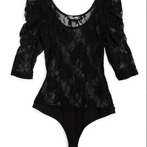 Pretty black floral lace bodysuit with ruched/scrunch short sleeves. Bottom snap closure. 2 snap positions at the bottom. Somewhat sheer. Great for layering!