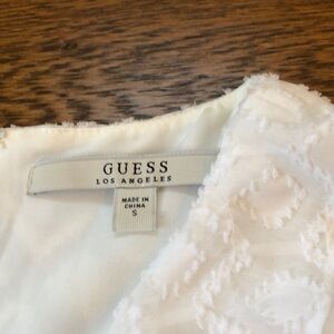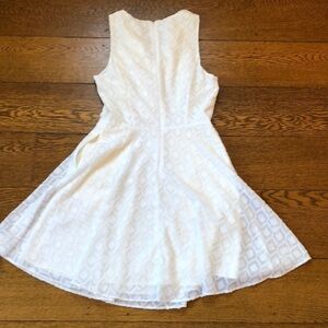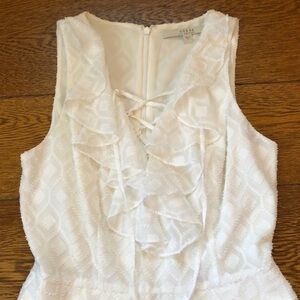 Flowy and romantic, this fit and flare dress by Guess features a stunning lace-up ruffled front. Delicate diamond printed design and sleeveless silhouette make this the perfect choice for a summer date night! Pair with leather sandals for a more low key outing, or dress it up with heeled wedges for a fancier dinner out. Excellent condition with no known flaws. Size S.