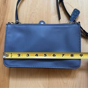 A leather-like crossbody bag featuring a front logo embossed panel, front pocket with snap closure, front logo emblem, zip-top closure and a mixed media strap.