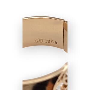 Add a bold designer touch to your stack with this striking GUESS leopard-print hinged bracelet. Wrapped in soft polyester faux-fur and set in polished gold-tone mixed metal, this statement piece features the iconic interlocking Guess logo at the center — instantly recognizable and effortlessly chic.