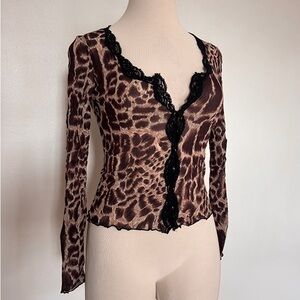 Stylish leopard print sheer top with elegant black lace trim. Perfect for a chic look.