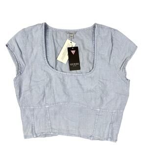 Stylish light blue crop top. Short sleeves. Square neckline. Perfect for casual outings.